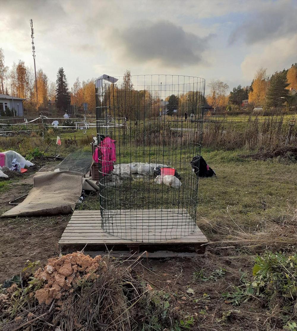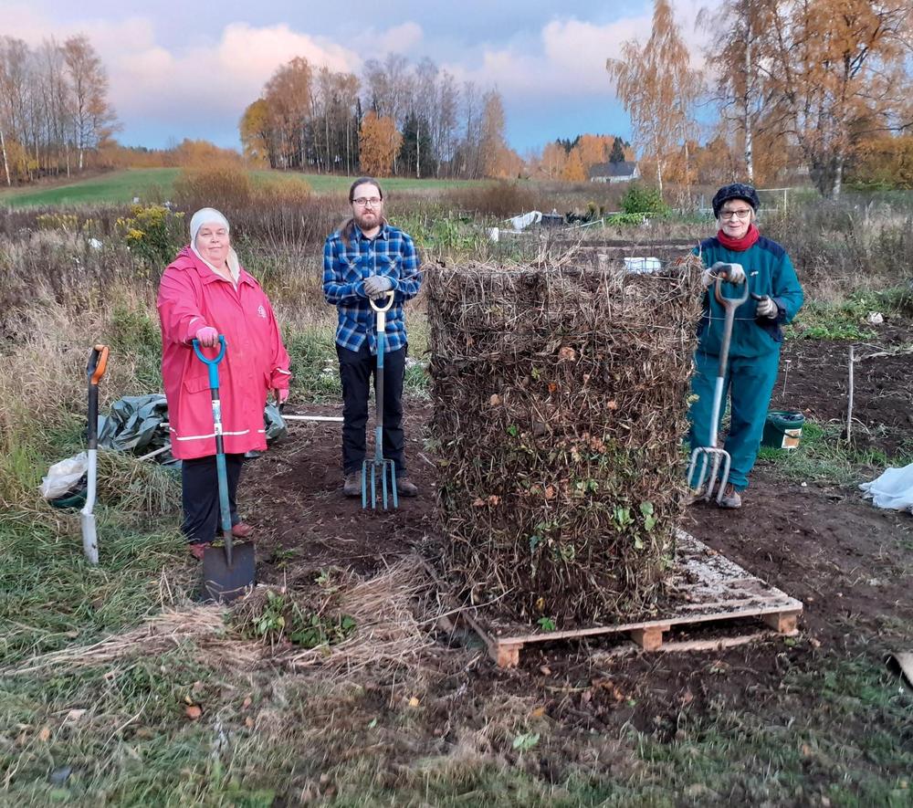 Kompostikurssilaiset pääsivät kokeilemaan kurssilla opittuja asioita, kun Takahuhdin palsta-alueelle koottiin kaksi bioaktiivista kompostia